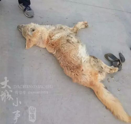 马先生家的牛圈搭在院门外,安着铁栅栏。这只动物趁马先生没注意,从栅栏的缝隙中钻进牛圈,试图袭击怀孕的母牛。没想到母牛护犊心切,一个多小时后,这只动物偷袭不成反受重伤,躺在牛棚里,浑身是血,已然命染黄沙。“在来村子前,这只‘狼’就已经满身鲜血,好像吃了什么动物。”围观人群中,一位年长的村民看到这只动物后,猜测它有可能是野狗和狼交配产下的种。这位村民说,这只动物的耳朵直立,尾巴下垂,眼睛上挑,与狼的外貌特征十分相似。