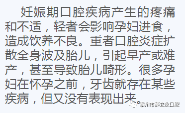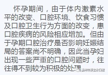 孕妇机体内部状况、饮食习惯的改变,以及对口腔护理的疏忽,常常会加快龋齿的发展。磨耗、楔状缺损的牙齿也会处于更加敏感的状态。一旦爆发急性牙髓炎或根尖周炎,会给孕妇带来难以忍受的痛苦,服药不慎可能给胎儿造成不利影响。