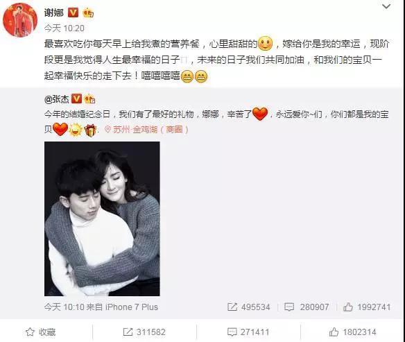 张杰说:你们都是我的宝贝。谢娜回应:嫁给你是我的幸运。