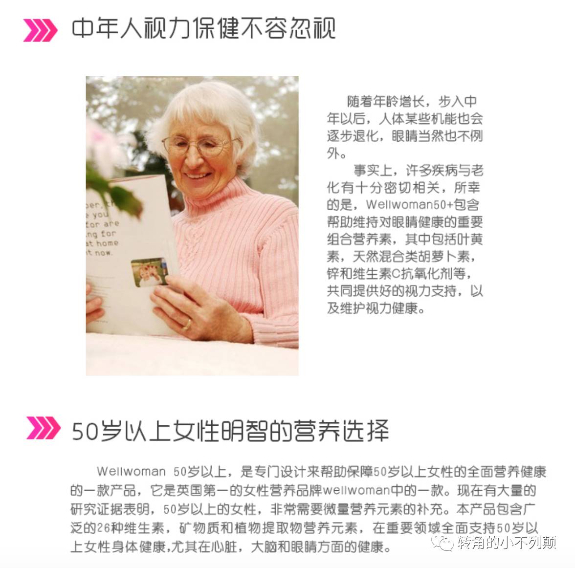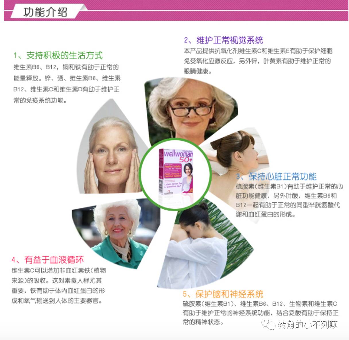 针对50岁以上女性而设计的营养补充配方,提供26种所需的营养元素,不含人工色素,无麸质、无防腐剂。可以保护细胞免受氧化应激反应,维护正常的眼睛健康;维护正常的心脏功能;维护免疫系统正常运作;促进血液循环;保护脑部以及神经系统功能,保证正常的健康以及精神状态。服用方法:每日1片,随餐服用,不能咀嚼。两盒包邮,319元;五盒更划算,699元。