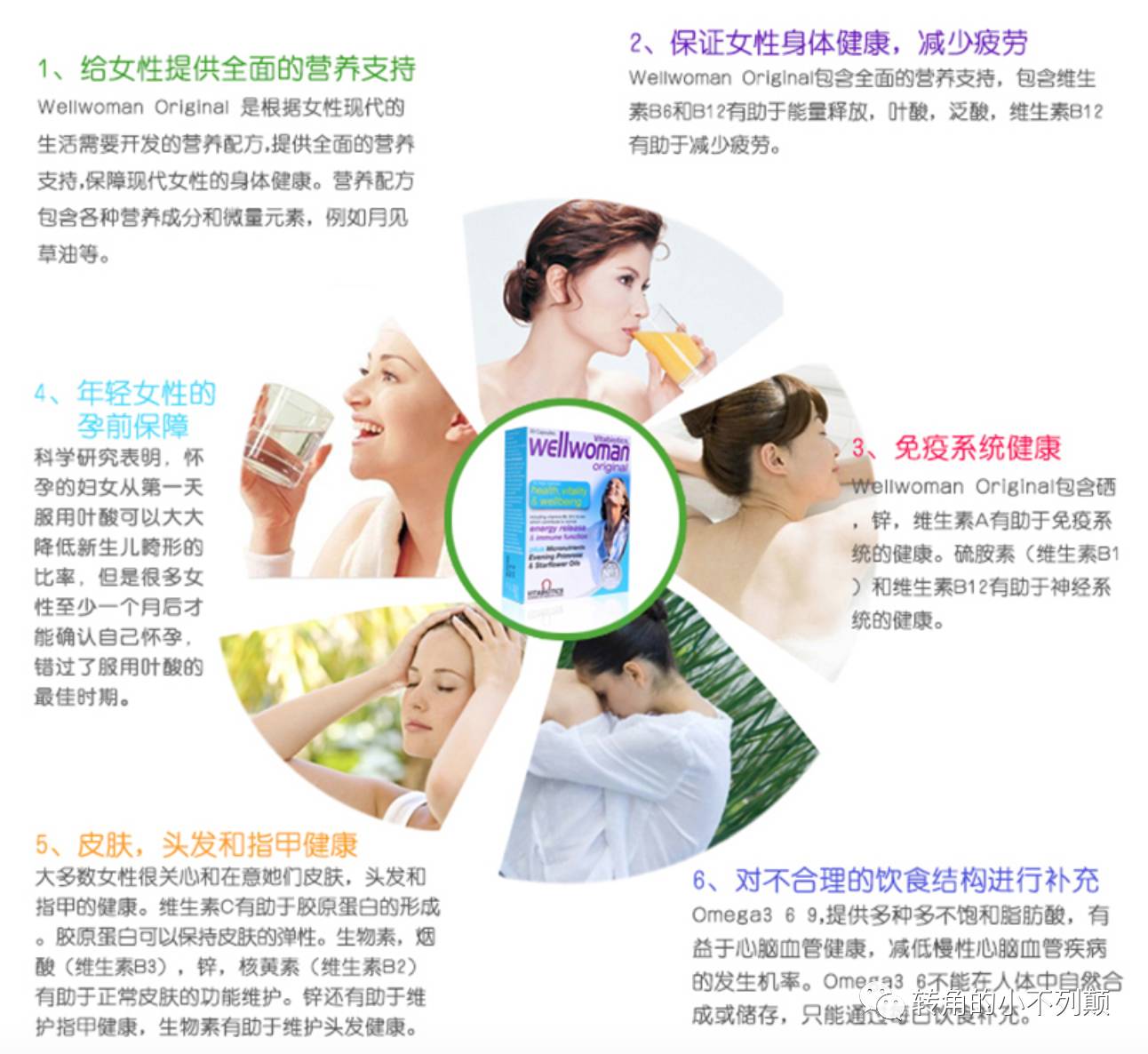 vana现在服用的是Wellwoman哦,现在真是越来越重视保养啦。vana把产品按照人群分成女士产品,男士产品,儿童产品,全家人产品、特殊需要的产品和怀孕前后产品。最后一类单独归结出来,那是全英国的孕妇产妇机会都在服用啊,哈哈,必须单独归为一类。