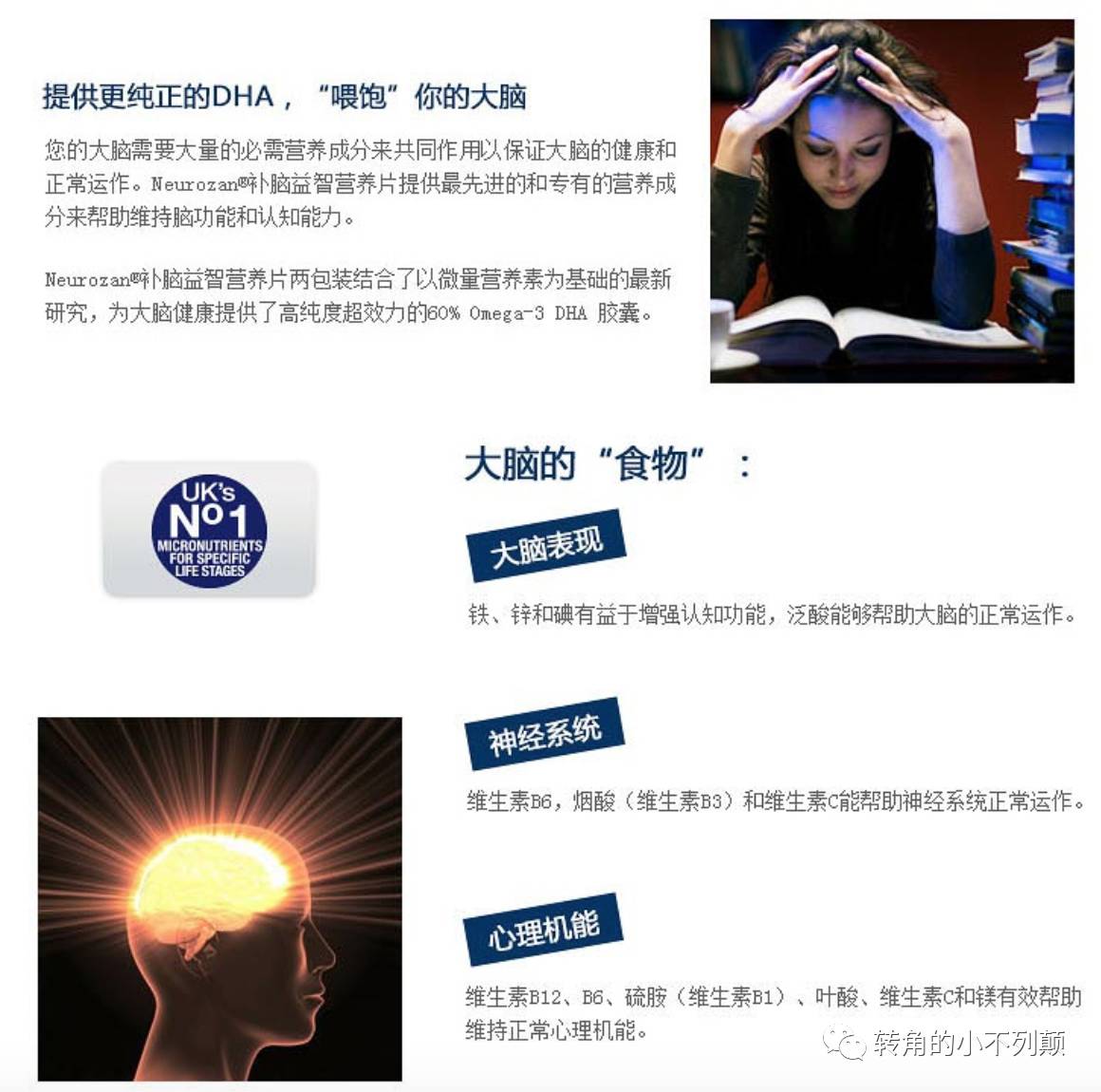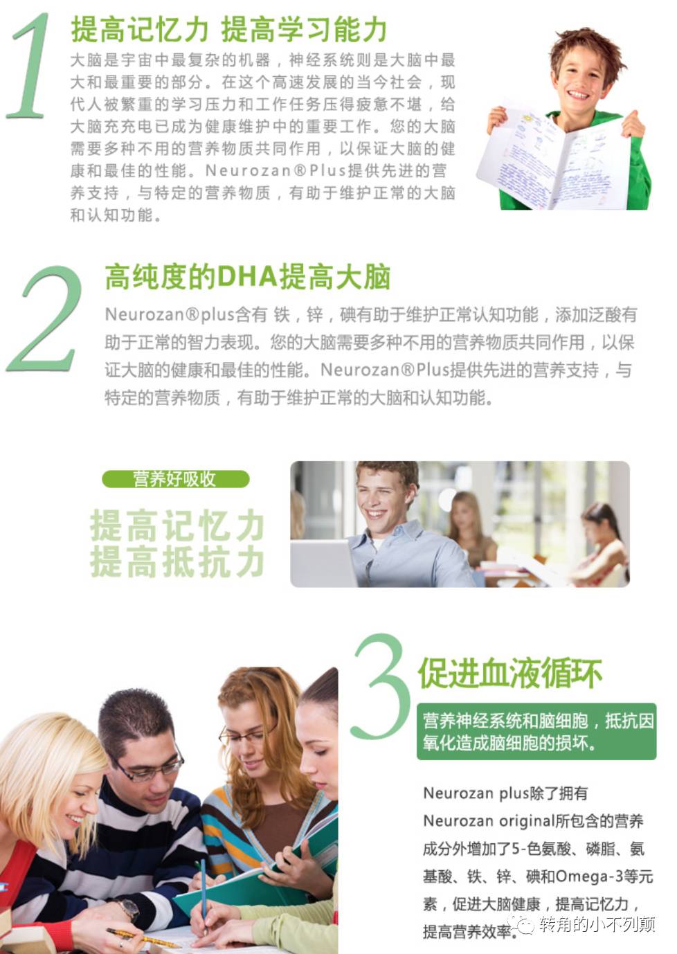 大脑需要大量的必需营养成分来共同作用以保证大脑的健康和正常运作。Neurozan 补脑益智营养片提供最先进和专有的营养成分来帮助维持脑功能和认知能力。Neurozan补脑综合片提供更纯正的DHA,喂饱你的大脑,提高记忆力以及学习能力,增强大脑智力,促进脑部血液循环。服用方法:每日1粒,随餐服用,不可空腹服用。两盒包邮,399元;四盒更划算,649元。