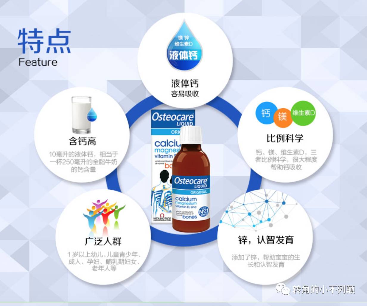 Osteocare 钙镁锌口服液,液体形态适合吞咽困难的人群食用,可以直达肠胃有利于人体吸收。含有丰富的钙、镁、锌以及维生素D,可以有效地促进自身对于钙的吸收,增强骨骼坚韧度,增强人体免疫力,维持人体正常食欲;增加骨密度,预防骨质疏松,预防冠心病以及心脑血管、神经系统的疾病。适合3岁以上全家人使用。三瓶包邮,299元。八瓶更划算,579元。
