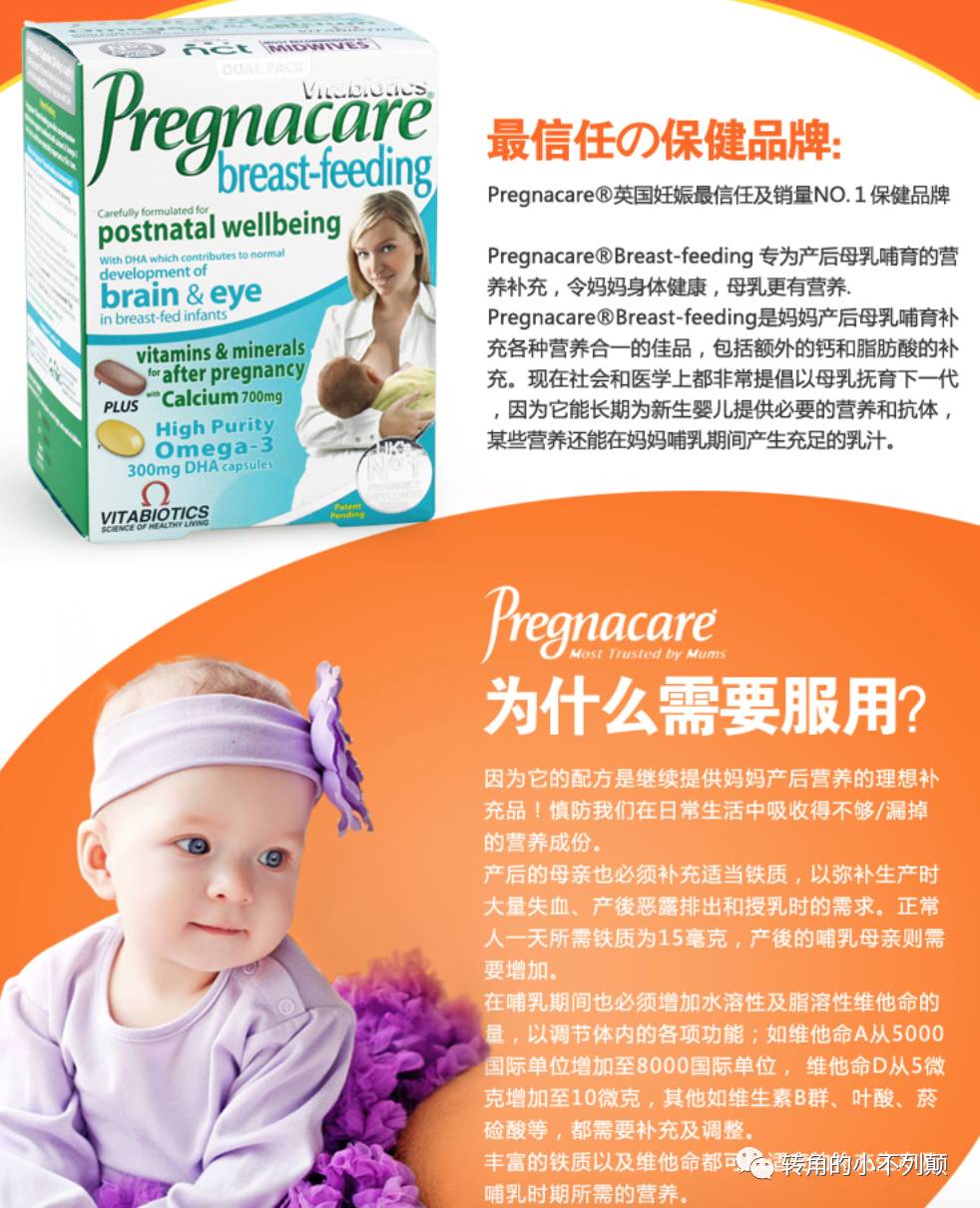 Pregnacare女性产后哺乳期复合维生素含有丰富的钙质、DHA以及维生素D3 K,以及其他身体所需的微量营养素,有助于母体产生健康营养的乳汁,从而保证宝宝摄取更加全面的营养。额外的钙和脂肪酸的补充能长期为新生婴儿提供必要的营养以及所需的抗体,增加宝宝的免疫力,促进宝宝身体健康。两盒包邮,469元;四盒更划算,839元。