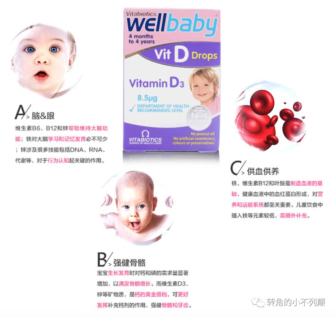 婴儿早期获得充足均衡的营养对宝宝当前和长期的身体健康、智力发育和免疫系统有着至关重要的作用。含有每日所需的维生素D3,促进钙质吸收,帮助骨骼发育。滴管设计,剂量准确,方便使用。服用方法:每天1次,每次0.5ml,用注射器吸取规定剂量后滴入宝宝的舌头。三盒包邮,299元。