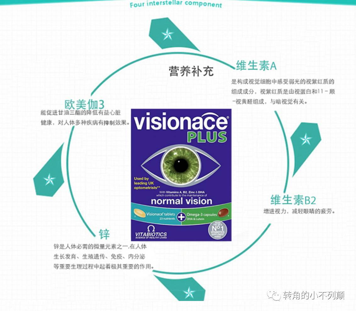 当今社会用眼的时间大大增多,电脑、手机、平板等各类电子产品一直在不断加重人们眼睛的负担。Visionace保护视力营养片加强版,有效缓和用眼疲惫不适感,维护视力健康正常,恢复视网膜运作。维生素A是构成视觉细胞中感受弱光的视紫红质的组成部分,直接影响暗视力;维生素B帮助增进视力,减轻眼睛疲劳;锌是人体必需的微量元素之一,在人体各个环节发挥着作用;Omega-3能促进甘油三酯的降低有益心脏健康,对人体多种疾病有抑制效果。每天黄色红色各一片。两件包邮,339元。