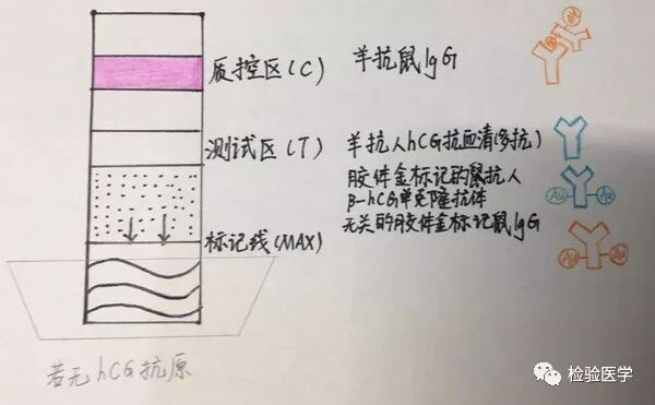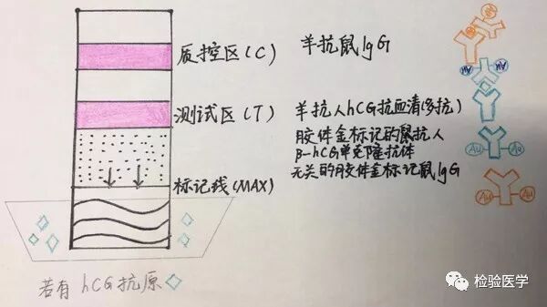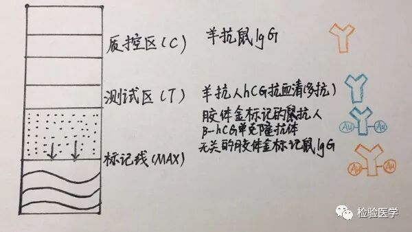胶体金是由氯金酸和枸橼酸合成的胶体物质,直径5~150nm胶体金颗粒在液体状态中呈现紫红色。以胶体金颗粒作为示踪物标记鼠抗人hCGβ链单克隆抗体(McAb),羊抗人hCG和羊抗鼠IgG多克隆抗体,应用大分子物质加以保护,并固相化与硝酸纤维素膜上。待检hCG在检测区域形成McAb-hCG-羊抗人hCG双抗体夹心抗原抗体复合物,呈紫红色。对照区则形成McAb-羊抗鼠多克隆抗体复合物,也呈紫红色。