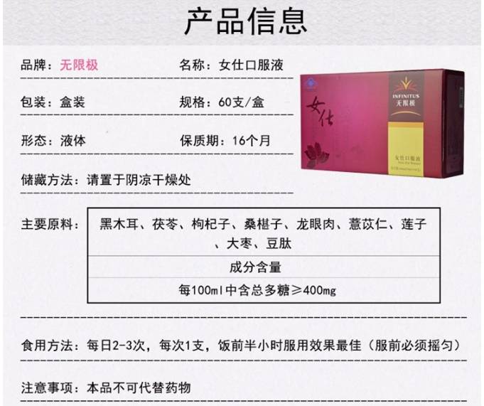 女仕口服液是以黑木耳、茯苓、枸杞子、桑椹子、龙眼肉、薏苡仁、莲子、大枣及豆肽等原料,经科学方法精制而成,含有丰富的氨基酸、维生素、矿物质、微量元素和免疫调节剂——复合多糖。经功能测试,具有延缓衰老和免疫调节的保健功能。