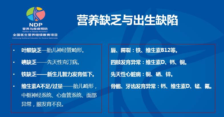 育龄妇女是铁缺乏和缺铁性贫血患病率较高的人群,怀孕前如果缺铁,可导致早产、胎儿生长受限、新生儿低出生体重以及妊娠期缺铁性贫血。因此,备孕妇女应经常摄入含铁丰富、利用率高的动物性食物,铁缺乏或缺铁性贫血者应纠正后再怀孕。碘是合成甲状腺激素不可缺少的微量元素,为避免孕期碘缺乏对胎儿智力和体格发育产生的不良影响,备孕妇女除选用碘盐外,还应每周摄入1次富含碘的海产品。叶酸缺乏可影响胚胎细胞增殖、分化,增加神经管畸形及流产的风险,备孕妇女应从准备怀孕前3个月开始每天补充400μg叶酸,并持续整个孕期。