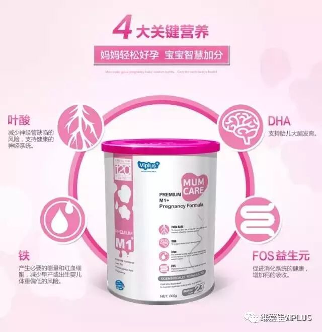 很多人都知晓补充叶酸的必要性,倘若叶酸不足,对于孩子的大脑,神经,脊髓发育是非常不利的,甚至会出现畸形儿,智障儿。而对于母体来说,少了叶酸,则会有胎盘早剥、流产等危险。孕妇奶粉中的叶酸含量丰富,在怀孕早期饮用,可大大避免风险。而且补充叶酸的黄金时间为孕前3个月开始至孕后3个月。