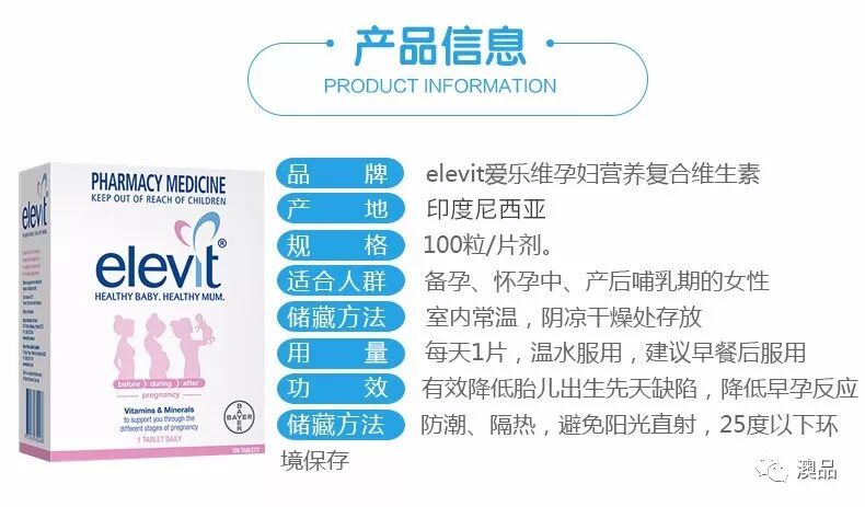 Eelevit 爱乐维孕妇孕期复合维生素叶酸片是唯一一个符合澳洲药监局推荐孕妇日常应服用营养标准的孕期维生素,富含11种维生素和8种微量元素,这些营养素怀孕前、怀孕期间、哺乳期都是需要给女性提供的营养物质。能够有效的帮助宝宝大脑的发育,支持宝宝的正常生长和健康的骨骼形成。有助于减少脊柱裂的危险,以帮助胎儿的健康发育。