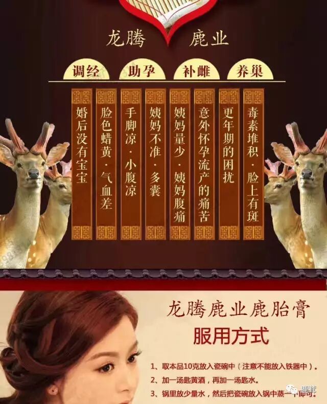 鹿胎膏用于对久育不孕,久不受孕、多囊卵巢、卵巢早衰、宫寒,宫壁薄,习惯性流产、产后腹痛。月经不调、行经腰腹疼痛、四肢无力、子宫寒冷、赤白带下、胃蒸劳热、调经养颜有以下的功效: