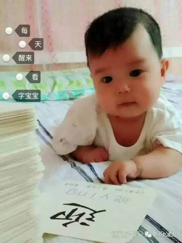 在孩子第8天时,持续看字卡43分钟,从第9天开始每天持续都至少在一个小时以上,34盒4000多张字卡很轻松就看下来,立夏那天,恩熙出生70天,在爸爸的配合下创了记录。看字卡并不是纯粹让孩子去认字,宝宝出生前三个月,他对黑白色很敏感,这个时候他的脑神经、视觉、听觉神经发展非常快,关于这个主题在微信分享里有详细记录,在这里就暂不分享,但我想对大家说的是:千万不要因为我们有限的世界,去局限孩子无限宽广的未来。