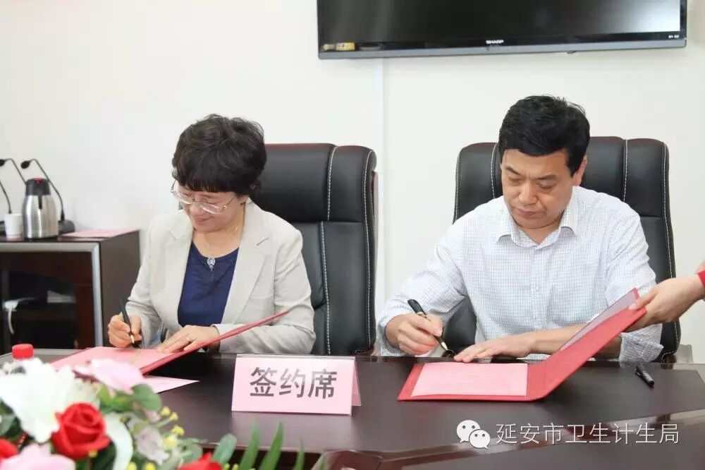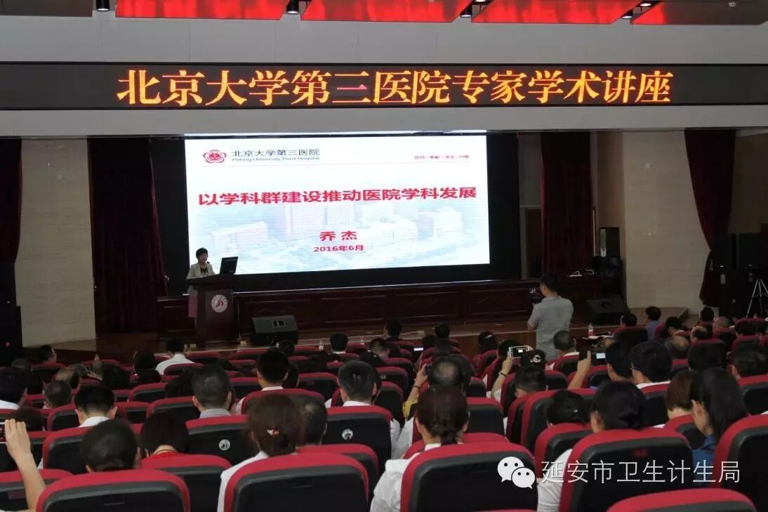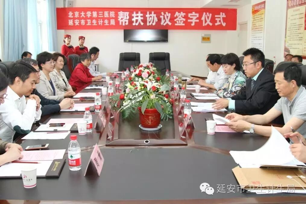 2016年6月3日下午, 延安市卫生和计划生育局与北京大学第三医院在市人民医院隆重举行业务帮扶协议签字仪式。仪式由市委副秘书长杜鹏主持,北京大学第三医院院长乔杰、党委副书记刘东明、海淀院区院长张福春、党校院区院长肖卫忠、总会计师李春、党院办常务副主任王鹏、医院服务管理办主任周蕾,延安市政府副市长赵璟、市卫生计生局局长郝建东、副局长王汉林等领导出席,市直及中省驻延各医院、各县区综合医院院长参加了签字仪式。