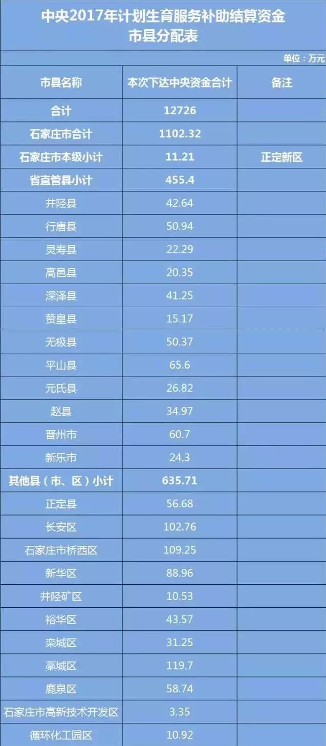 为进一步加强计划生育服务工作,近日,河北省财政厅发布《关于下达2017年中央财政计划生育服务补助资金的通知》。文件指出,本次下达中央资金合计12726万元,涵盖河北13市。其中石家庄共分配到1102.32万元,快看看你家乡的分配情况!