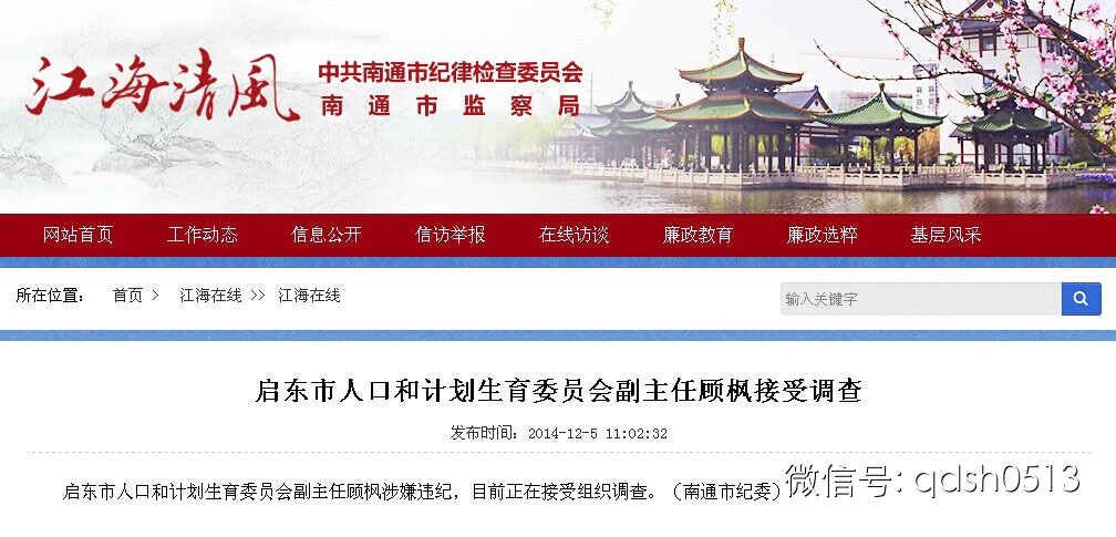 据南通市纪委官方网站“江海清风网”12月5日消息:启东市人口和计划生育委员会副主任顾枫涉嫌违纪,目前正在接受组织调查。(南通市纪委)