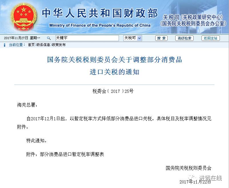 在此前降税的基础上,自2017年12月1日起,我国将以暂定税率方式,降低部分消费品进口关税,范围涵盖食品、保健品、药品、日化用品、衣着鞋帽、家用设备、文化娱乐、日杂百货等各类消费品。