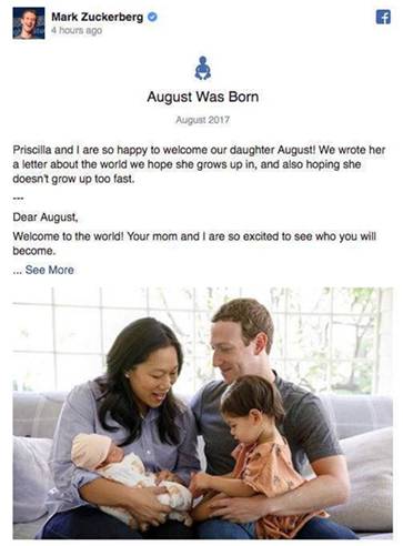小扎延续了以往低调务实的作风,只是告诉大家,家中迎来二公主August,并没告知具体生日等细节。