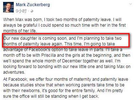小八月出生前,小扎就在脸书“喊话”,要休2个月产假陪女儿↓↓↓