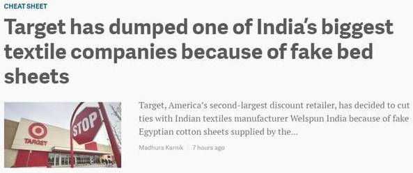 根据商业网站QUARTZ报道,由于印度纺织品生产商Welspun的孟买总部提供了仿造的埃及棉床单。美国第二大零售商Target公司决定切断与其公司之间的联系。