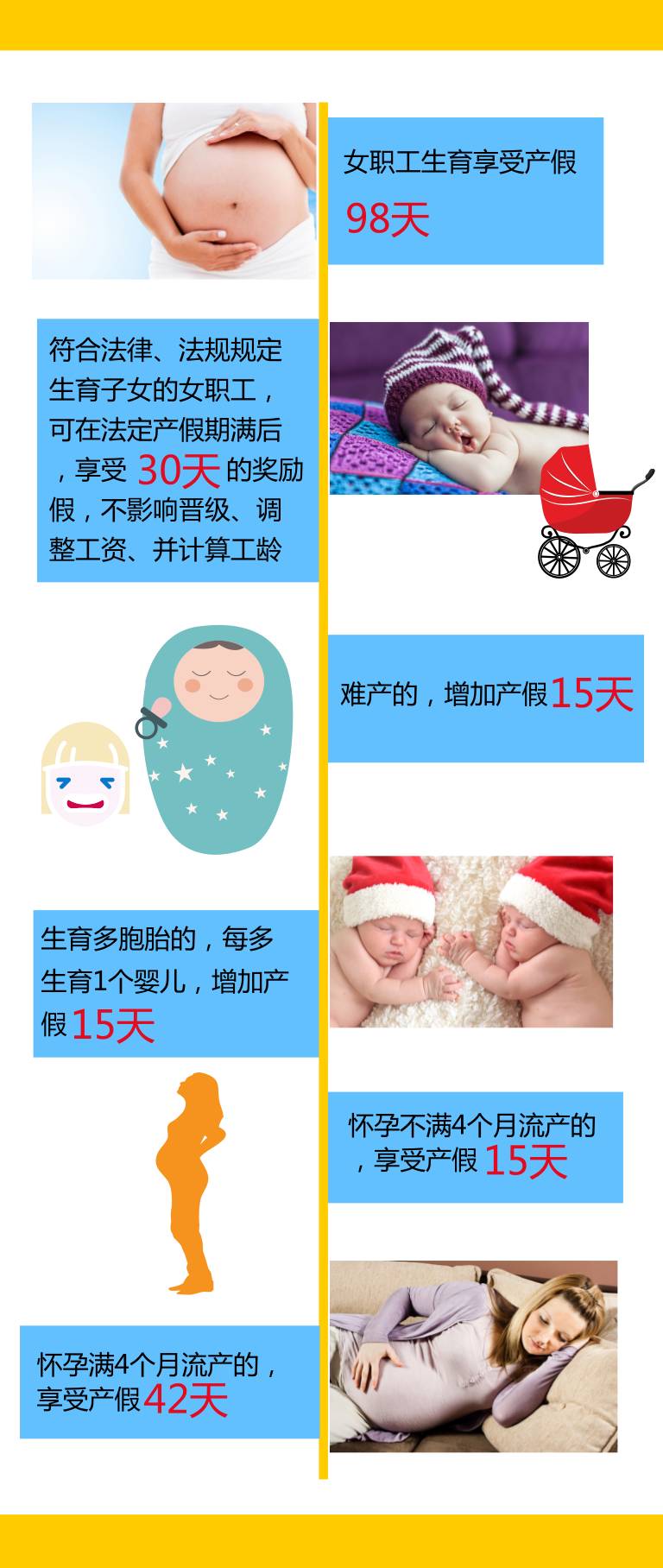二孩放开后,关注产假的女性职工越来越多了,产假怎么休?从什么时候开始算?依然是职场中“准妈妈”关注的焦点。在原《办法》中,女职工正常分娩的,其产假不少于90天。新《办法》明确规定,女职工生育后享受产假98天。