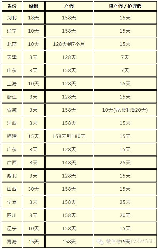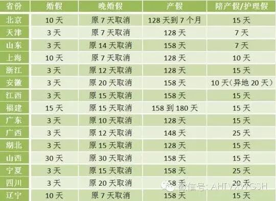 截至目前,各地婚假、产假、陪产假/护理假的最新天数,具体可见下表: