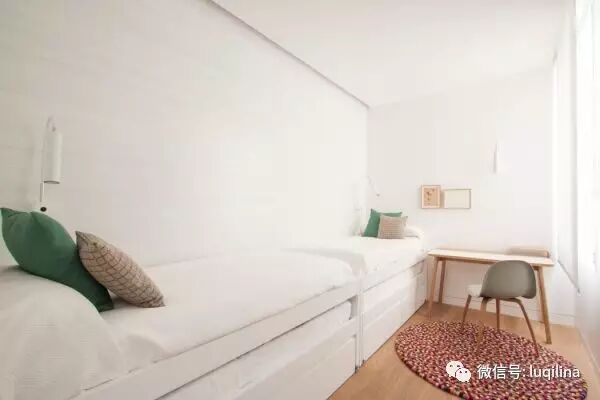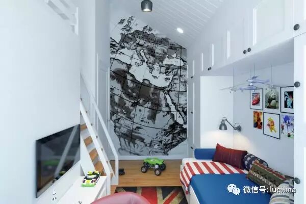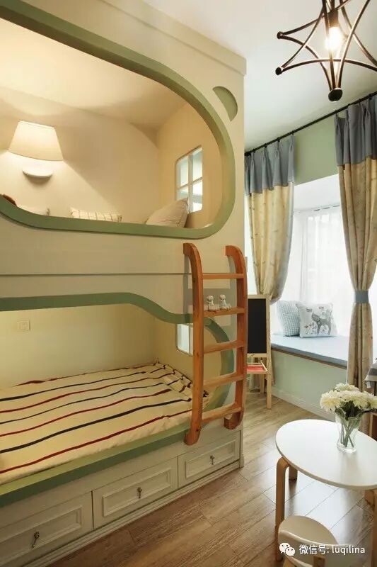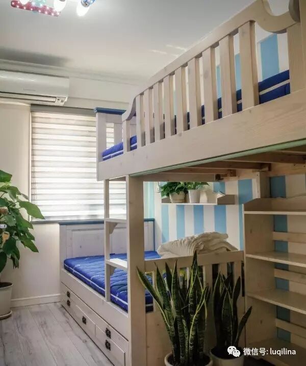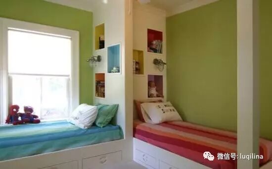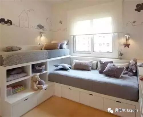 如果是方正的户型,可利用房间拐角设计两张80-1米2的儿童床,