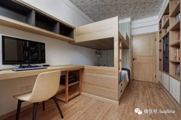 如果儿童房的宽度在2.8米以上,就可以实现L型错层床,比起商场里买到的一体式上下床,这种定制床不会很压抑,上下都有独立的休息空间,而且还见缝插针设计了柜子、书架、写字台,而这些仅仅占用了4-5平米的空间面积。▼