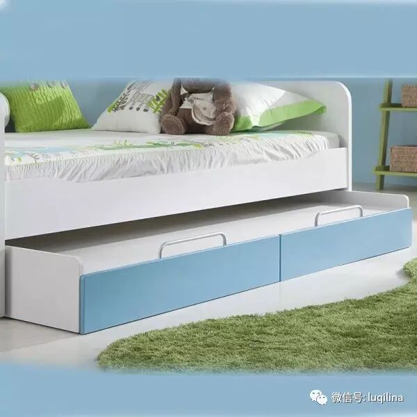 小户型的儿童房如果太小,可以定制一个拖床,这样白天隐藏在床底下,晚上轻轻拉出来就能睡觉,也是节省空间的典范。▼