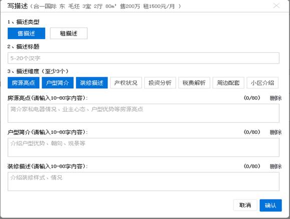 每条描述至少选择3个维度,租售描述分开写,不要弄混哦~