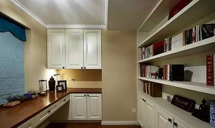 九、书房的空间其实是主卧那边的一个储藏的空间,类似于阳台的一个空间,然后往里面挪了一点,改成了书房,书桌做成了固定的,书柜大大的,足够啦。