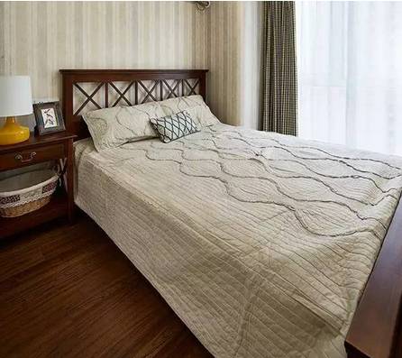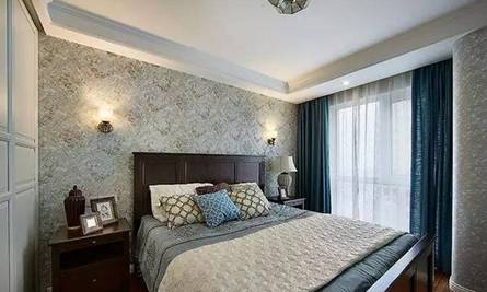 七、主卧走了蓝色系风格,很深邃悠远唯美的感觉,墙壁是美美的碎花壁纸,和床品的颜色相搭配,效果赞!