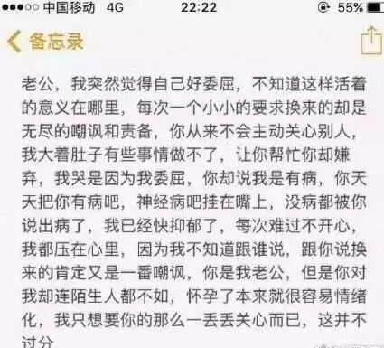 事件中的二胎妈妈就是如此,从她留下的遗言和日记可以看出,怀孕之后,丈夫就对她失去了耐心。面对她崩塌的情绪,换来的只是“神经病,无理取闹”这样的嘲讽和呵斥,满心的委屈让她不知道像谁倾诉,全部郁积在心里,成为猝死的病因。而且老公更是可能多次婚内出轨,甚至出去找小姐,扔下刚生完孩子还在坐月子的她在家中,老公的漠然终于成为压死骆驼的最后一根稻草,留下不可挽回的悲剧。