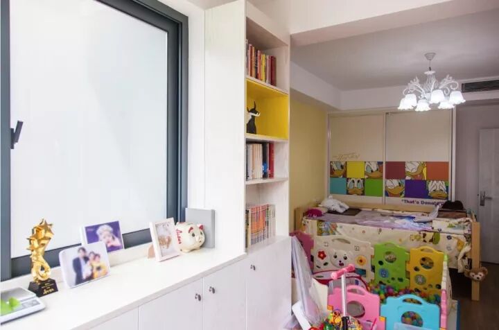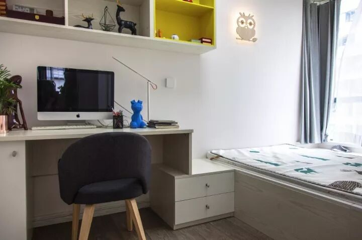 孩子慢慢长大,所以儿童房一定要满足她学习生活的需求,收纳空间要足、娱乐空间要有、学习空间更要有。所以女儿的房间针对休息区和学习区有一个简单的划分,用书桌做了一个简单的分离,也是充分利用墙面空间,增加收纳。