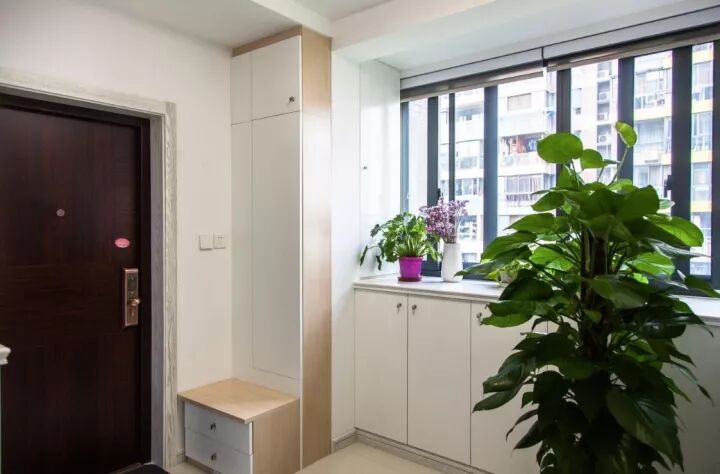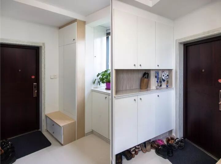要满足家中六口人,家里的玄关还是以功能性为主。入门两边放置容纳性超强的木质玄关柜是在索菲亚定制的,可以坐着放鞋、换鞋、放包、挂衣服,空间利用得当。点击蓝字查看余先生家用的柜体定制品牌索菲亚全屋定制 。