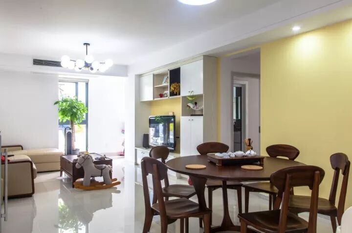 黄色和白色的墙体给人的感觉很舒服,白色的电视柜,客厅和餐厅之间没有隔断,地面瓷砖也是浅色的,整个客厅的采光超级棒。