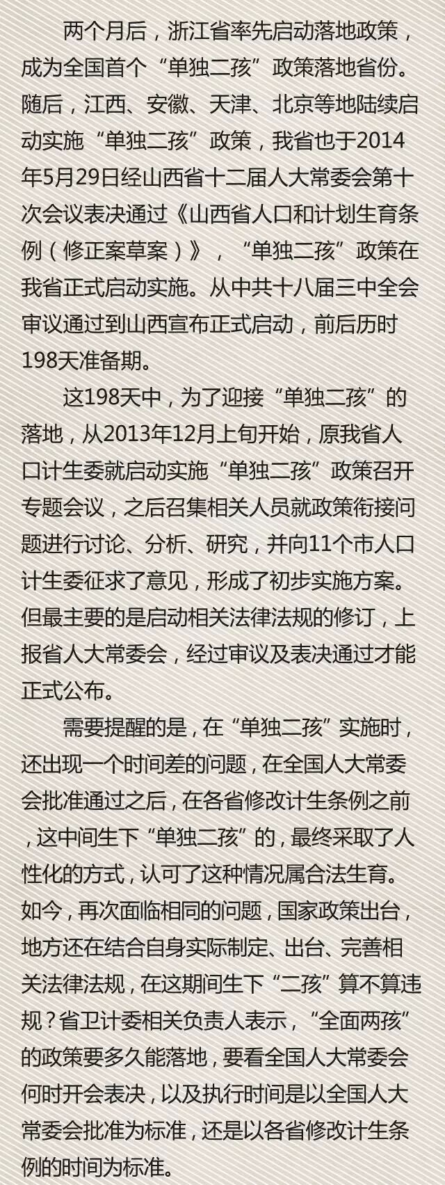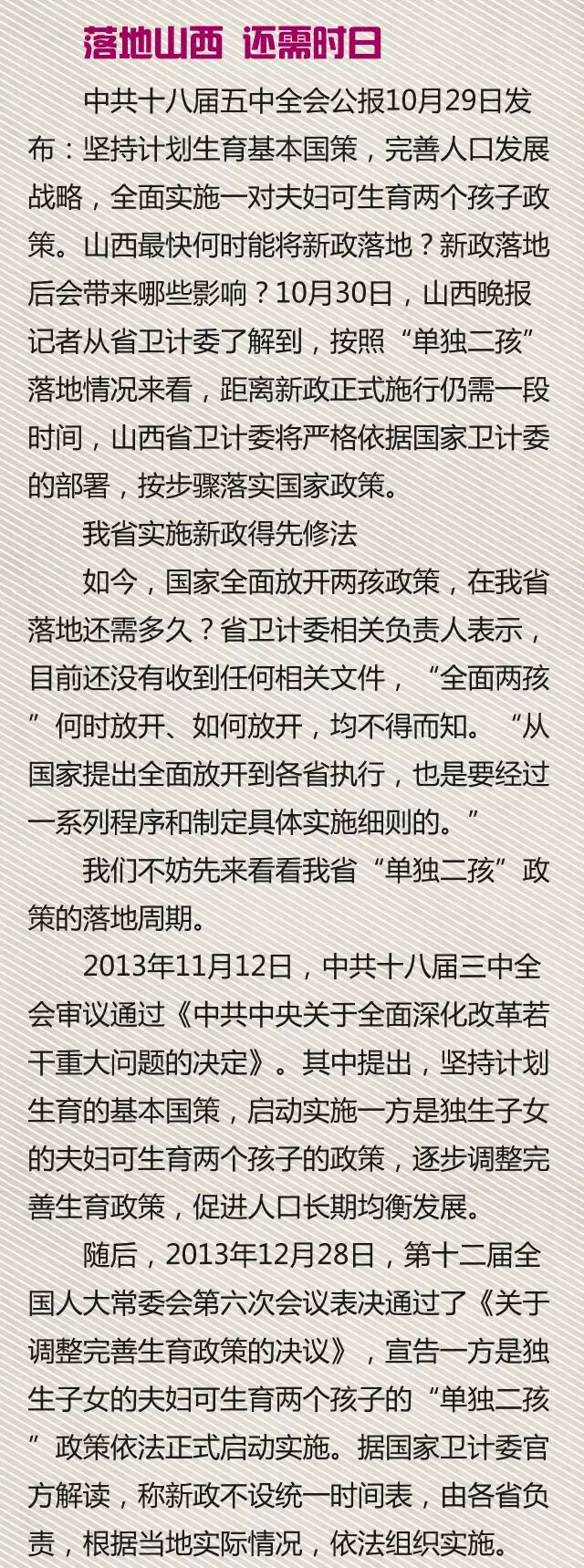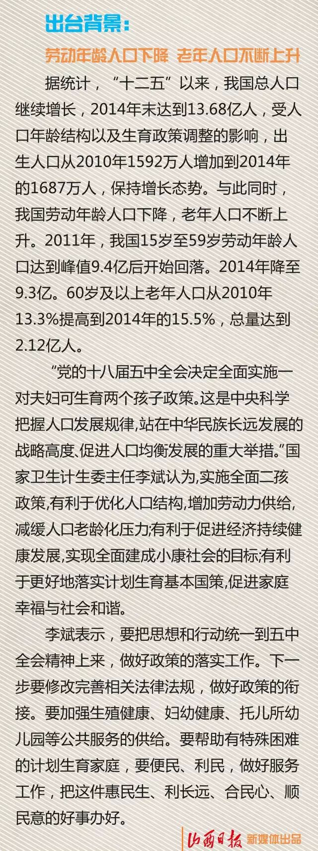 2015年10月29日,党的五中全会公报允许普遍二孩政策,将允许每对夫妇生两个孩子。政策规定:坚持计划生育的基本国策,完善人口发展战略,全面实施一对夫妇可生育两个孩子政策,积极开展应对人口老龄化行动。这是继2013年,十八届三中全会决定启动实施“单独二孩”政策之后的又一次人口政策调整。全面二胎政策一出台,铺天盖地的声音便接踵而至。全面二胎的政策是在一个怎样的背景下出台的?什么时候可以全面实施?山西全面二胎何时能落停……小编为其整理一些权威的官方声音,供大家解读参考。