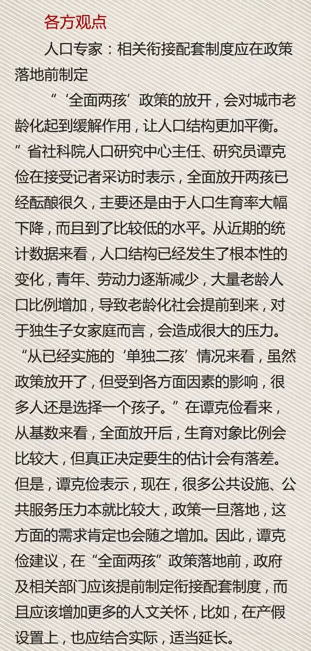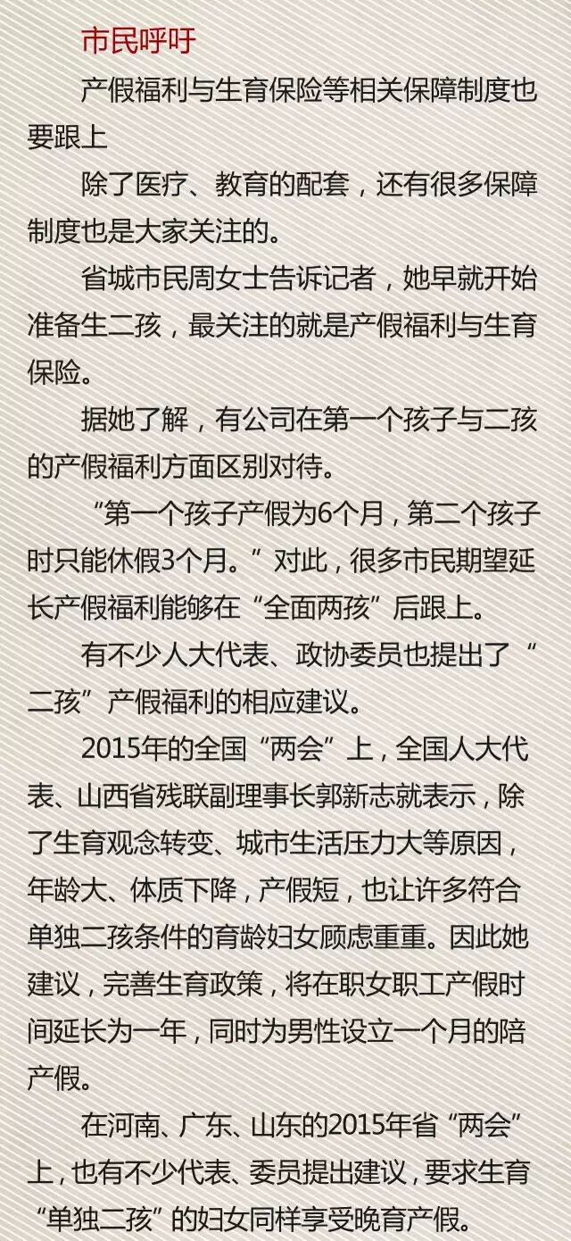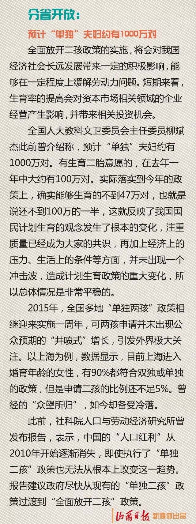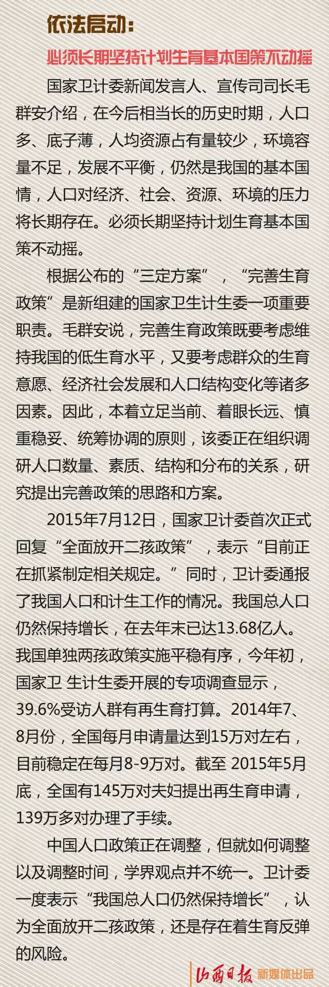 2015年10月29日,党的五中全会公报允许普遍二孩政策,将允许每对夫妇生两个孩子。政策规定:坚持计划生育的基本国策,完善人口发展战略,全面实施一对夫妇可生育两个孩子政策,积极开展应对人口老龄化行动。这是继2013年,十八届三中全会决定启动实施“单独二孩”政策之后的又一次人口政策调整。全面二胎政策一出台,铺天盖地的声音便接踵而至。全面二胎的政策是在一个怎样的背景下出台的?什么时候可以全面实施?山西全面二胎何时能落停……小编为其整理一些权威的官方声音,供大家解读参考。