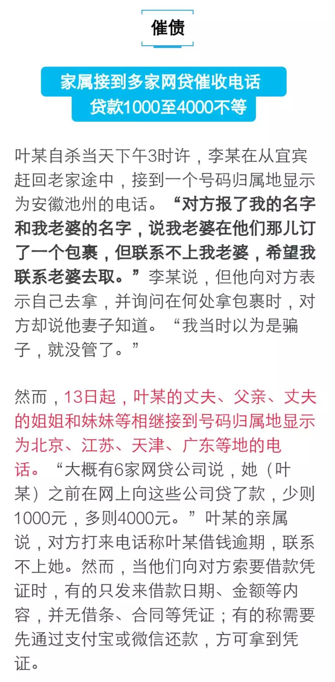 “我们没有把她(叶某)自杀的事情告诉他们,他们拿小孩来说事,我们认为这就是威胁和恐吓。”李某说,他们怀疑叶某自杀前,可能遇到网贷公司催收人员催账,而且对方可能存在以家人尤其是小孩作为威胁的“恐吓”行为。“但手机在警方那,里面的内容还没完全解开,我们也不清楚到底有没有恐吓内容。”