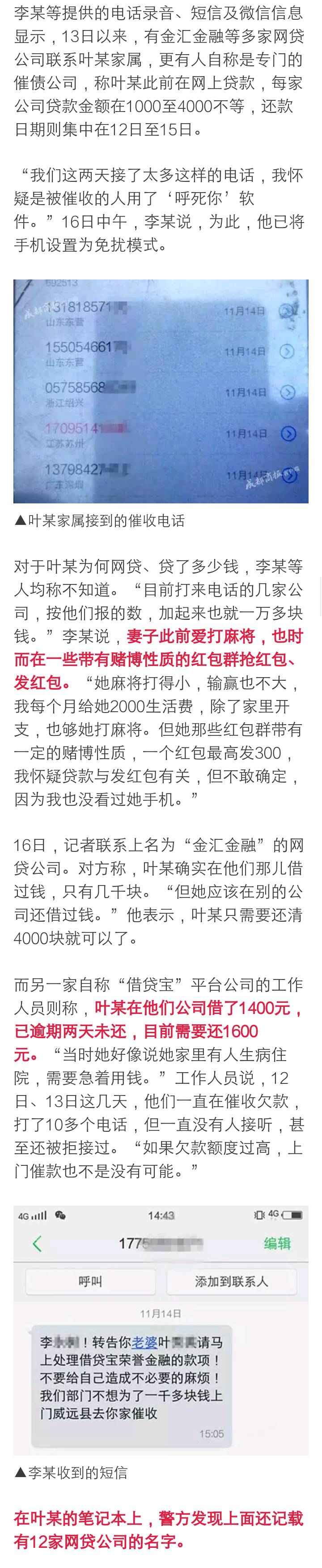 “按他们所说,她(叶某)于11月6日在金汇金融贷了4000元,拿到2000元。”李某及叶某的弟弟说,但联系该公司催收人员,对方一会儿说先还4000元,一会又说3万元一次性解决。“但我们喊他们带着凭证来家里拿钱,对方又说来家里就需要10万元才行。就算4000块钱,短短几天,利息也不可能这么高吧。”