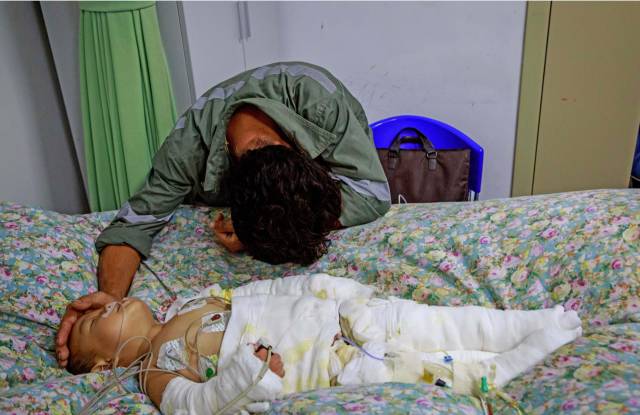 23日下午,刚刚进行完烫伤第一次手术的小松躺在病床上,身体和下肢缠满了白色的纱布,由于剧烈疼痛,1岁半的小松时不时地抽搐。