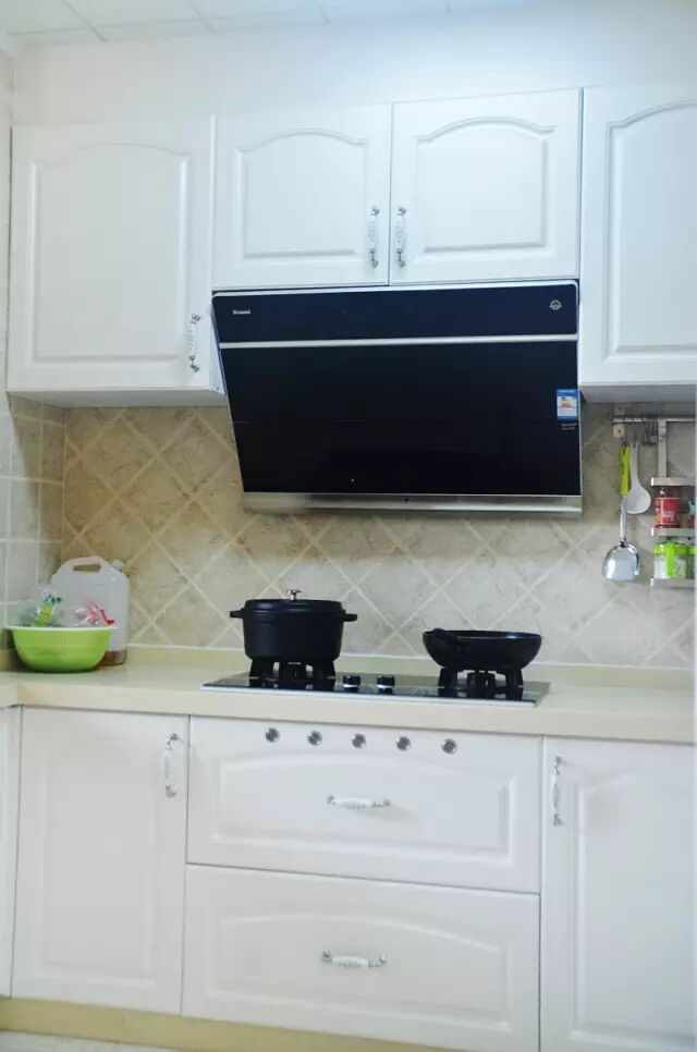 ▲ 因为厨房较小,光线不是很足,加之觉得浅色给人清爽,所以挑了款浅色的砖;橱柜则选择了大理石柜体、淡黄色石英石台面、白色的吸塑面板的橱柜。