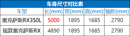 其实新车最大的改变就是在车身加长了,由现款RX的4890mm,加长了110mm,达5000mm。但是轴距并未发生改变,依然为2790mm,与汉兰达一样。RX350L将采用2+2+2和2+3+2两种座椅布局,但是轴距不加长硬多了第三排,空间够用吗?