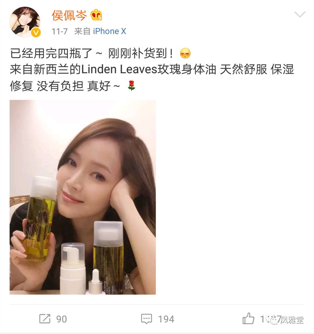 前些天侯主播在微博不小心暴露了自己的秘密神器,Linden Leaves玫瑰身体油,让她容光焕发,肌肤始终保持细腻滋润,时刻美丽动人。原来女神是这样保养的,很多女孩子立刻坐不住了,这到底是什么神器?!下面小编就帮大家解惑!