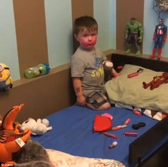 8月24日,加拿大一个可爱的小男孩达蒙(Damon)被家人发现手和脸都被画红了,原来他偷走了姐姐的化妆品为自己和玩具“化妆”。