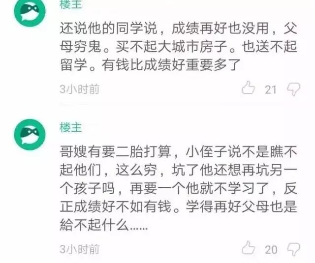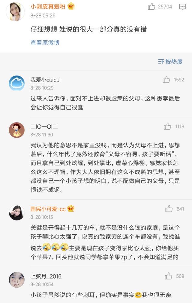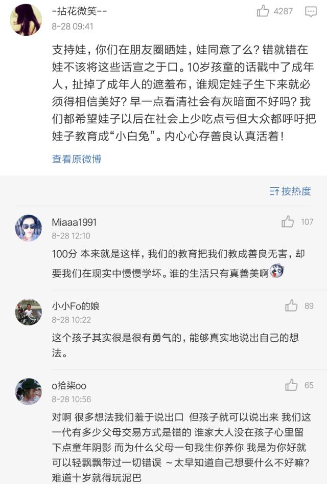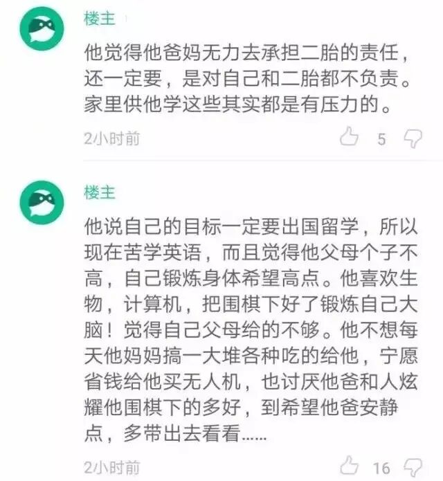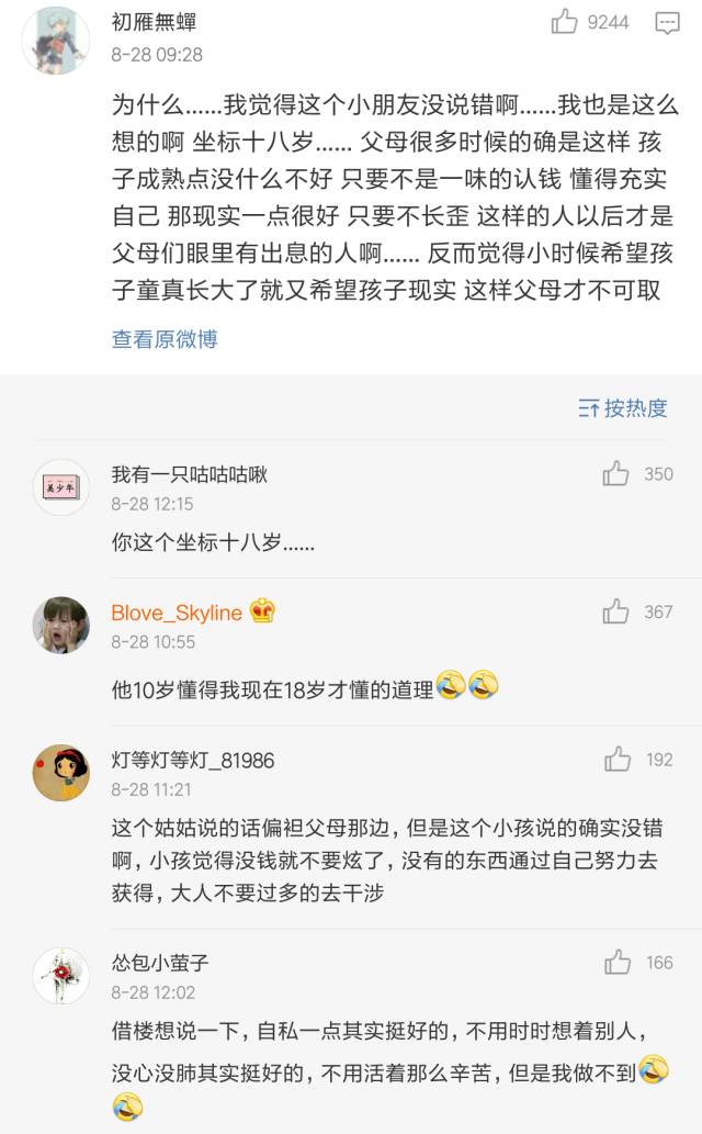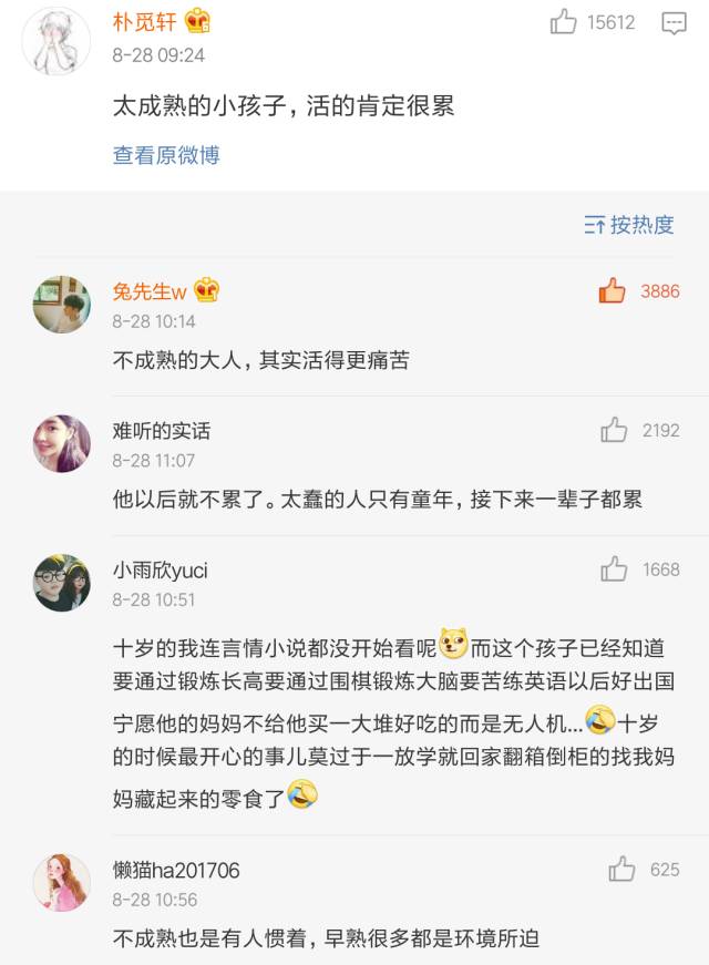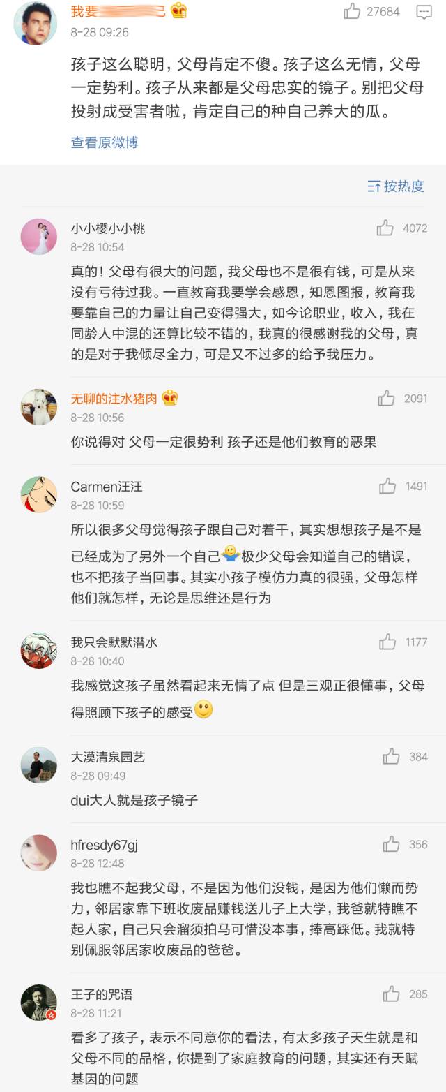 最后冷哥表达一下自己的看法,孩子小小年纪,思想就这么成熟、或者说势力,一定和家长教育过程中,急功近利的浮躁心态是分不开的,这不能怪他。