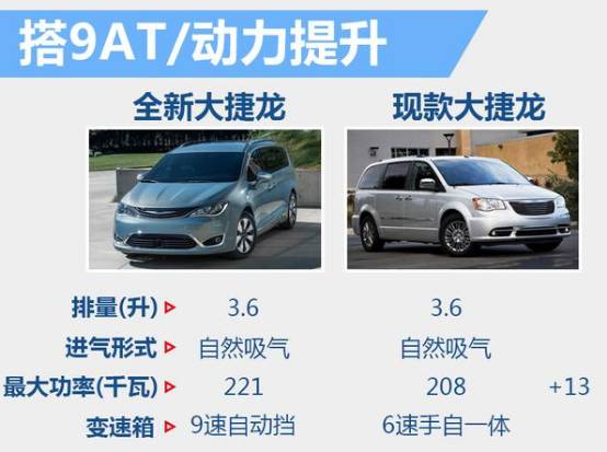 动力方面,全新大捷龙依然搭载3.6升Pentastar V6发动机,通过全新调校后这台发动机的最大功率为221千瓦,相比现款3.6升发动机最大功率多出13千瓦。此外,全新大捷龙还将搭载一台3.2升涡轮增压发动机,为消费者提供更多选择。在传动系统方面,新车将舍弃现款所搭载的6速手自一体变速箱,而采用ZF(采埃孚)提供的9速自动变速箱,在换挡平顺性以及油耗方面或有新的惊喜。此外,新一代大捷龙还有望推出一款插电式混动版车型。