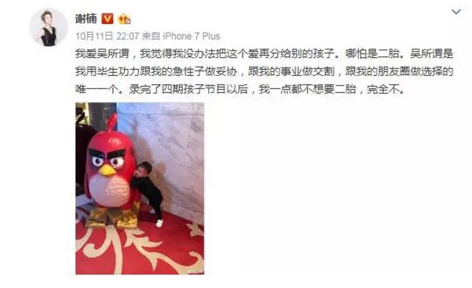 有天,谢楠在微博上坦明:拒绝生二胎。
