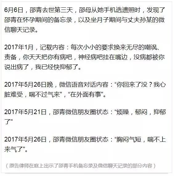 手机里的这些内容,让邵青父母认为,女儿的婚姻并不如表面所见的美满,恰恰相反,他们认为正是女婿孙某对女儿的长期冷落和言语攻击,才会让女儿长期处于精神抑郁的状态,并导致心脏猝死!