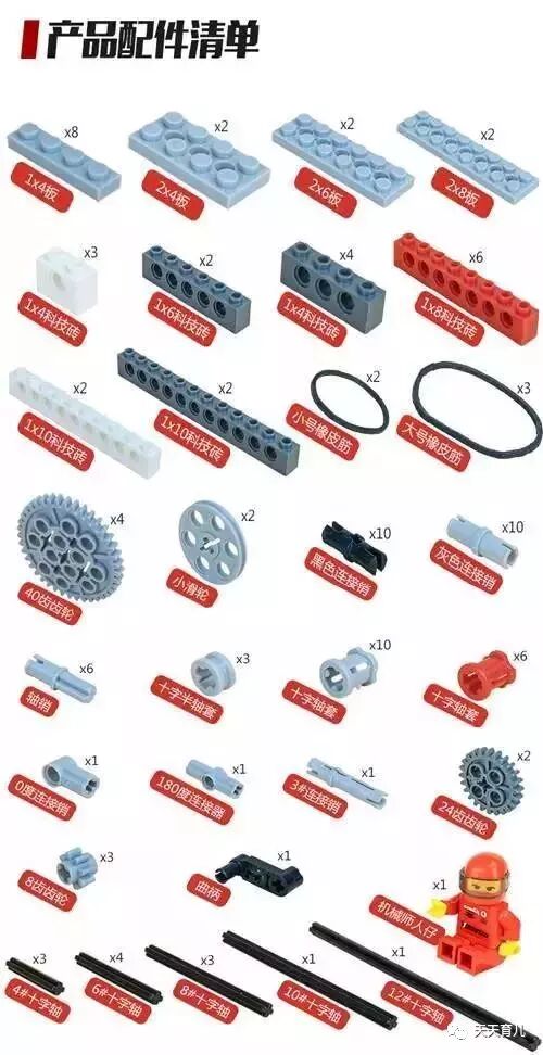 整套玩具包含100多块乐高式积木,有齿轮、带孔砖、操纵杆、连接器、十字轴、皮筋等多种科技系列零件,其中很多是乐高都没有的积木配件,外面也不容易买到。